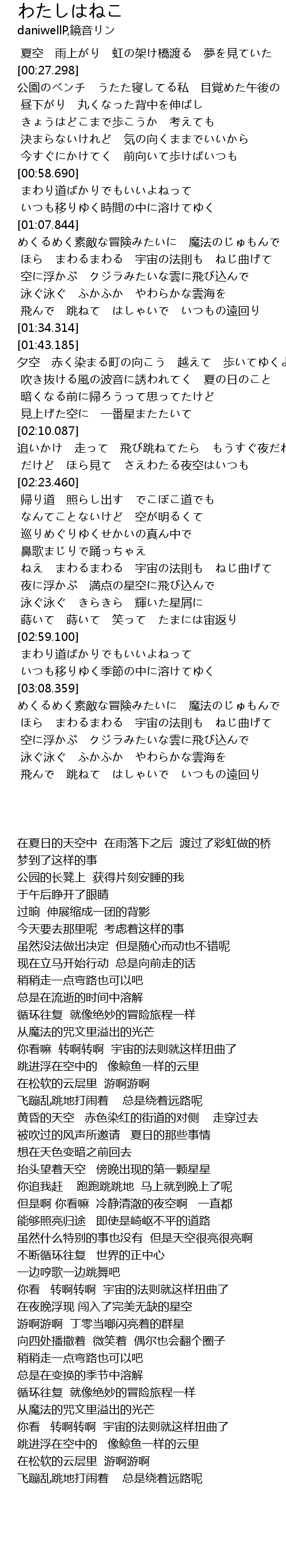 | [01:29.853] | 飛んで 跳ねて はしゃいで いつもの遠回り |