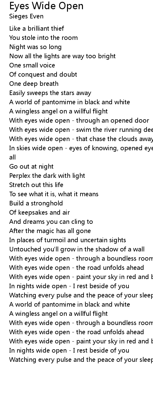 In skies wide open - eyes of knowing, opened eyes, and they've already seen it all |