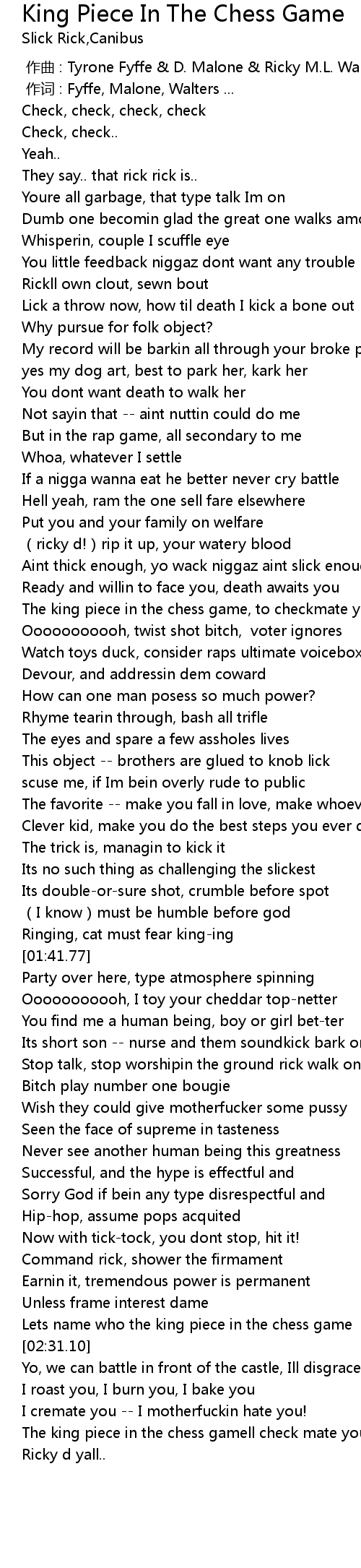 | [03:15.60] | The king piece in the chess gamell check mate you, nigga! |