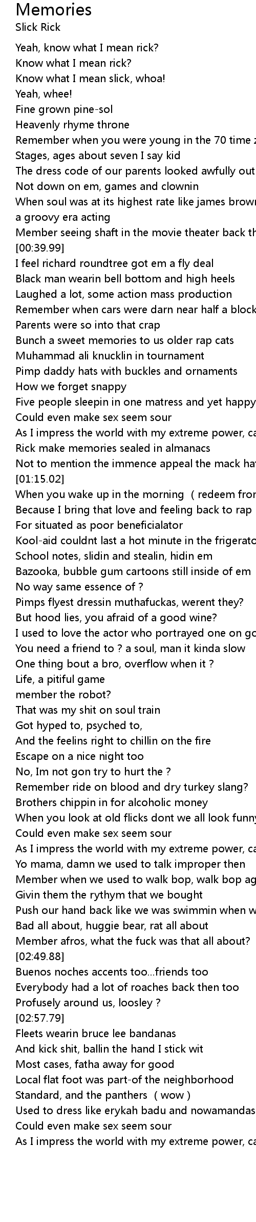 | [00:52.99] | Bunch a sweet memories to us older rap cats |