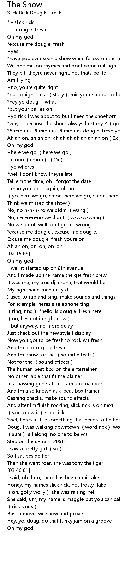 | [03:02.51] | (ring, ring) *hello, is doug e. fresh here |