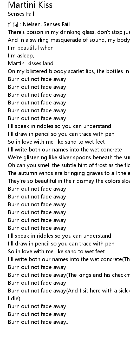 | Burn out not fade away(And I sit here with a sick grin)(Choking as I laugh until I die) | |