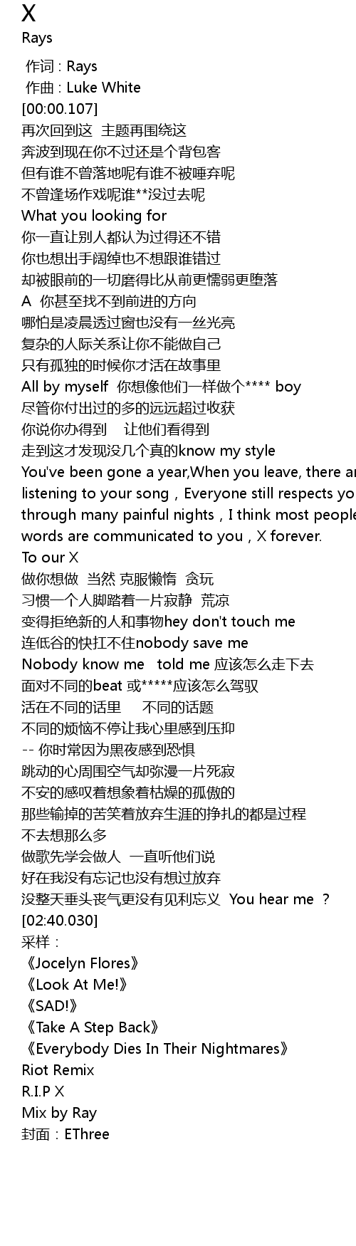 | [01:35.276] | You' ve been gone a year, When you leave, there are still people listening to your song, Everyone still respects you, You still accompany me through many painful nights, I think most people are the same, I hope these words are communicated to you, X forever. |