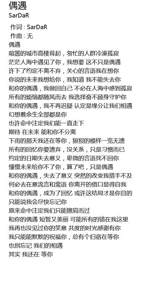 | [01:29.129] | 和你的偶遇,我不再迟疑 认定是缘分让我们相遇 |