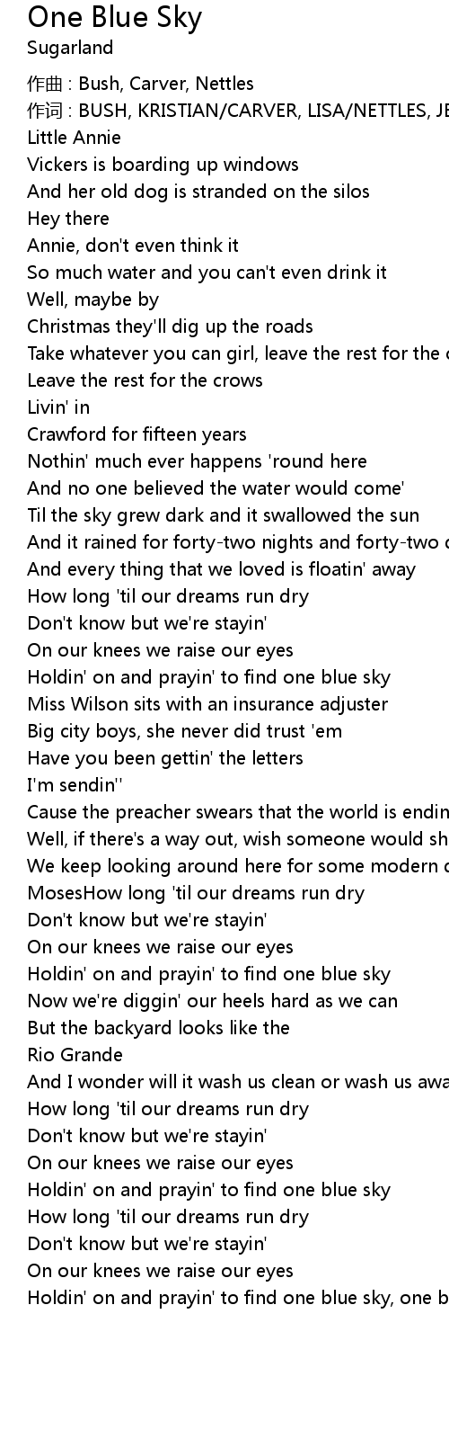 | Holdin' on and prayin' to find one blue sky, one blue sky |