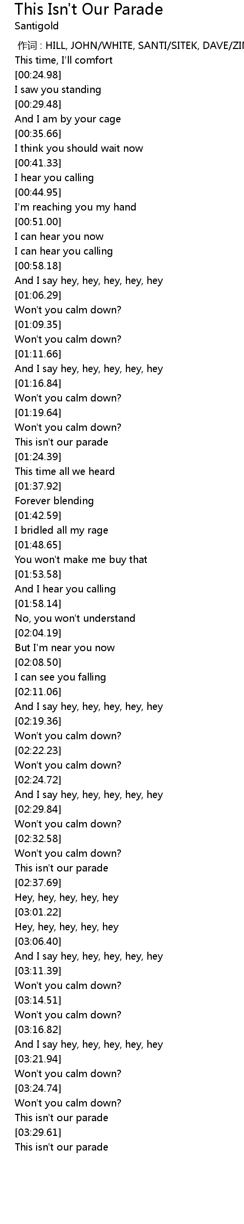 | [03:12.51] | Won' t you calm down? |