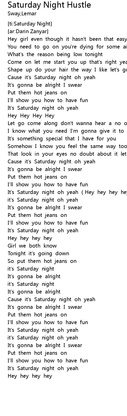 | [01:40.68] | It's Saturday night oh yeah (Hey hey hey hey) |