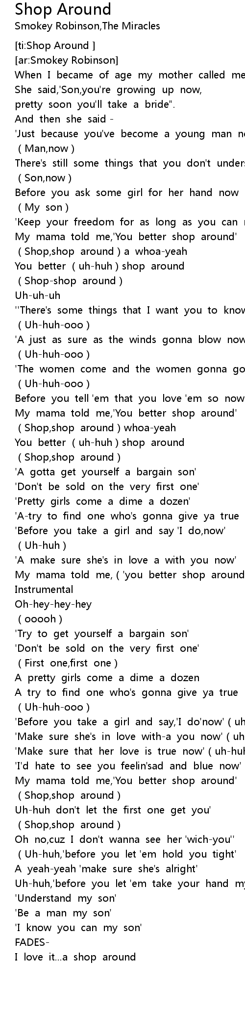 | [00:53.274] | My mama told me,' You better shop around' |