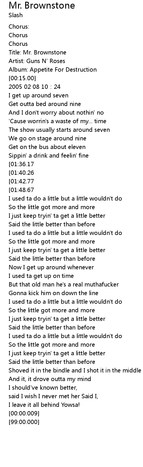 | [02:59.49][01:36.17][00:59.58] | We been dancin' with Mr. Brownstone |