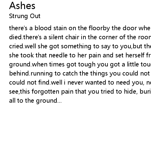 there's a blood stain on the floorby the door where your whole world fell and died.there's a silent chair in the corner of the roomwhere you sat alone and cried.well she got something to say to you,but the words never mean a thing,so she took that needle to her pain and set herself free.burn! burn it to the ground.when times got tough you got a little tougherthen you slowly fell behind.running to catch the things you could not see,running to catch what you could not find.well i never wanted to need you, now it's time for you to see,this forgotten pain that you tried to hide, buried in your apathy.burn! burn all to the ground...