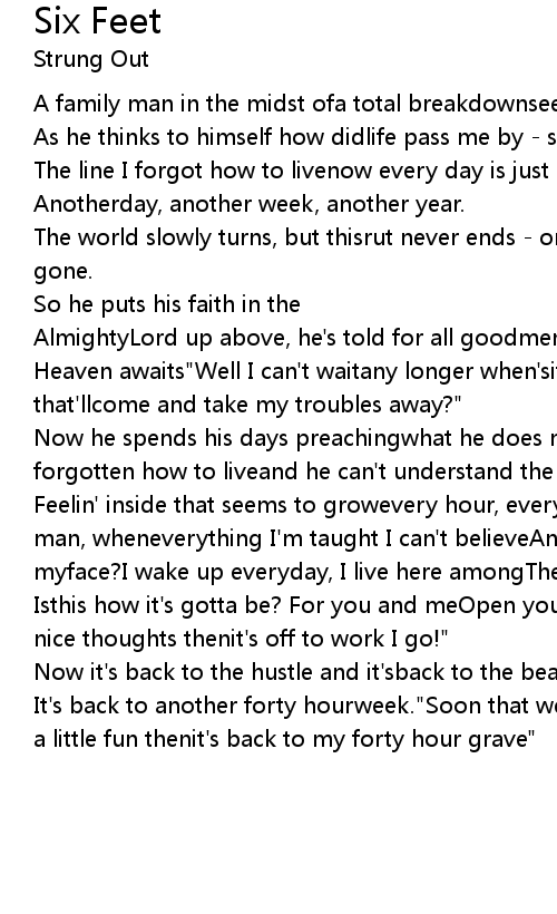 Feelin' inside that seems to growevery hour, every day."What's it take to be a man, wheneverything I'm taught I can't believeAnd everything is thrown right in myface?I wake up everyday, I live here amongThe dead and I am one of them. Isthis how it's gotta be? For you and meOpen your eyes take a look around think nice thoughts thenit's off to work I go!" |