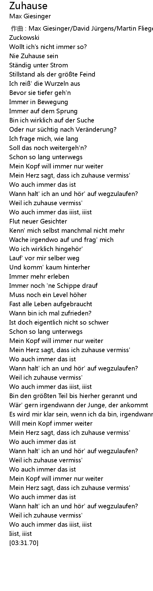 | [02:56.67] | Mein Herz sagt, dass ich zuhause vermiss' |