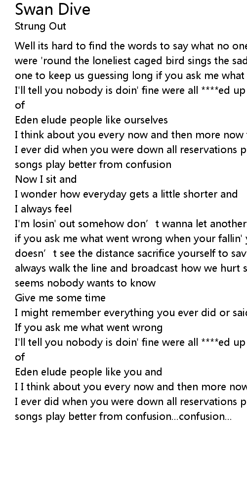 | Well its hard to find the words to say what no one would say to you when you were ' round the loneliest caged bird sings the saddest song and you were never one to keep us guessing long if you ask me what went wrong | |