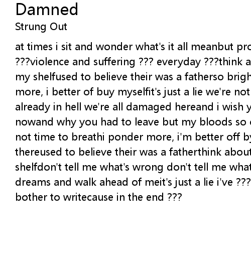 at times i sit and wonder what's it all meanbut progress has destroyed us ???violence and suffering ??? everyday ???think about the dusty bible sitting on my shelfused to believe their was a fatherso bright but he's not therei ponder more, i better of buy myselfit's just a lie we're not going to heavenwe're already in hell we're all damaged hereand i wish you well i wonder where you are nowand why you had to leave but my bloods so coldand my heart is cold and i have not time to breathi ponder more, i'm better off by myselfso bright but he's not thereused to believe their was a fatherthink about the dusty bible sitting on my shelfdon't tell me what's wrong don't tell me what's righttake your hopes and dreams and walk ahead of meit's just a lie i've ??? too many times to even bother to writecause in the end ??? |