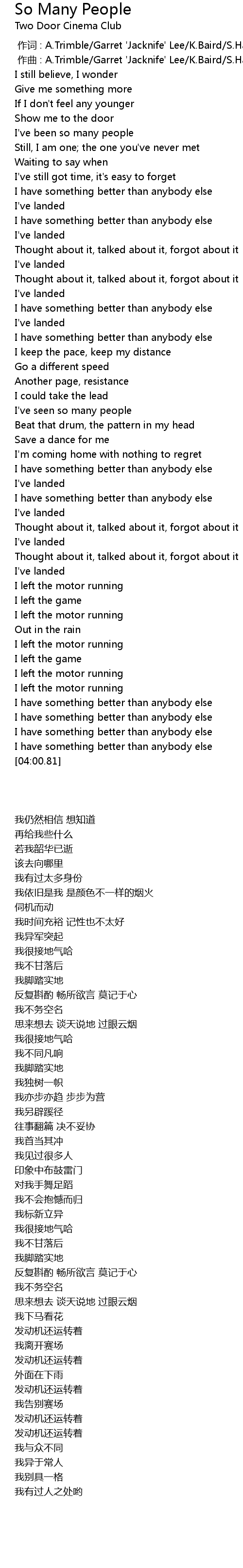 | [00:00.000] | zuò cí : A. Trimble Garret ' Jacknife' Lee K. Baird S. Halliday |