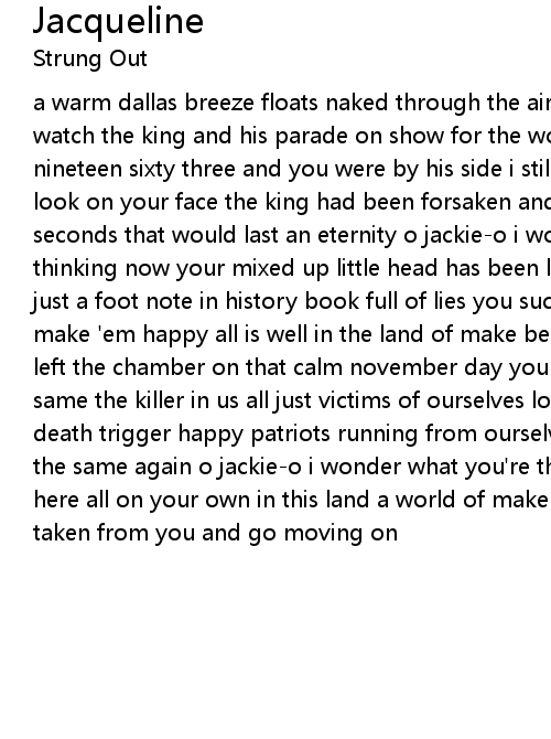 a warm dallas breeze floats naked through the air as a million hungry faces watch the king and his parade on show for the world to see prime time america nineteen sixty three and you were by his side i still remember pictures that look on your face the king had been forsaken and his country died in three seconds that would last an eternity o jackie-o i wonder what you could be thinking now your mixed up little head has been left alone in a world so cold just a foot note in history book full of lies you such a good girl keep smiling make 'em happy all is well in the land of make believe as soon as the bullet left the chamber on that calm november day you knew the world would never be the same the killer in us all just victims of ourselves looking for the perfect death trigger happy patriots running from ourselves you knew it would never be the same again o jackie-o i wonder what you're thinking now you've been left here all on your own in this land a world of make believe you get back what was taken from you and go moving on |