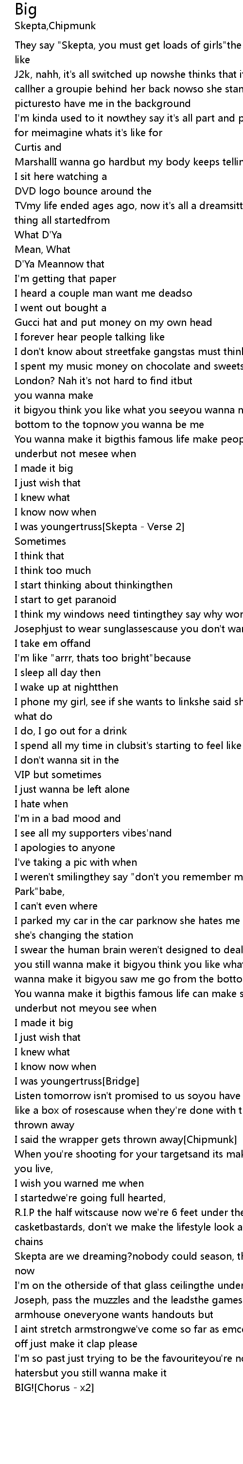| I swear the human brain weren't designed to deal with all this information[Chorus]you still wanna make it bigyou think you like what you seeyou wanna make it bigyou saw me go from the bottom to the topnow you wanna be me | |