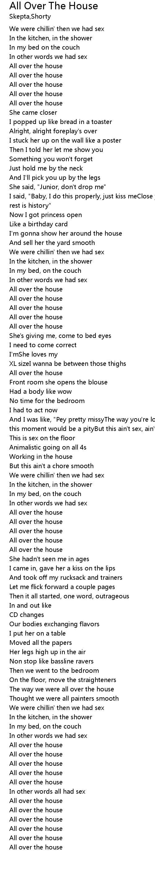 | And I was like, "Pey pretty missyThe way you're looking is, oh, so prettyTo lose this moment would be a pityBut this ain't sex, ain't city, this is sex kitchen" | |