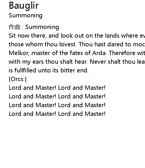 | Sit now there, and look out on the lands where evil and despair shall come upon those whom thou lovest. Thou hast dared to mock me, and to question the power of Melkor, master of the fates of Arda. Therefore with my eyes thou shalt see, and with my ears thou shalt hear. Never shalt thou leave from this place until all is fullfilled unto its bitter end. | |