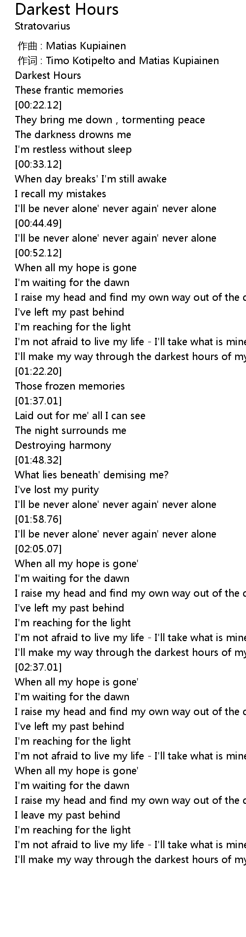 | [00:00.341] | zuò cí : Timo Kotipelto and Matias Kupiainen |