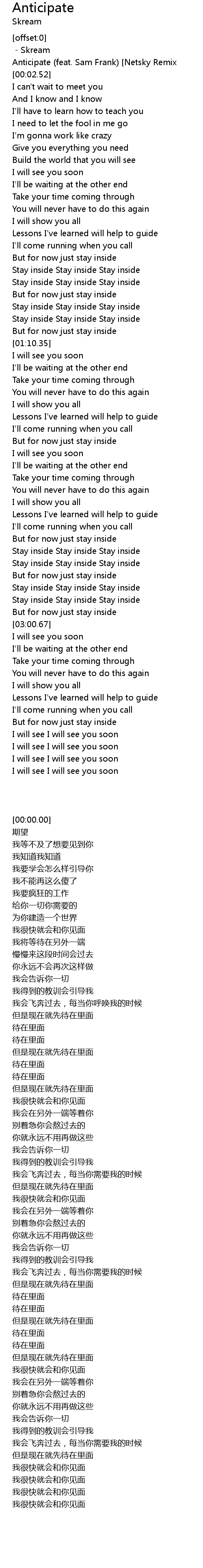 | [00:00.57]Anticipate (feat. Sam Frank) [Netsky Remix] |