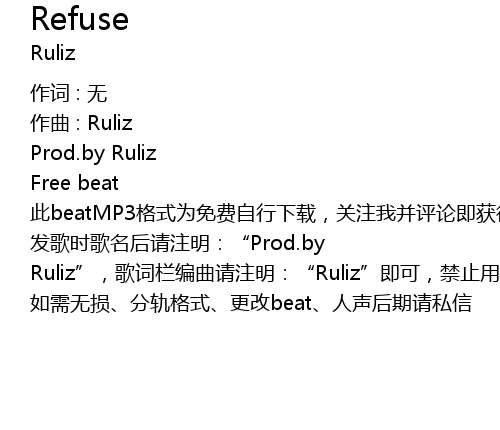 | 发歌时歌名后请注明:“Prod.by Ruliz”,歌词栏编曲请注明:“Ruliz”即可,禁止用于商业性质,尊重知识产权,侵权必究,谢谢。 | |