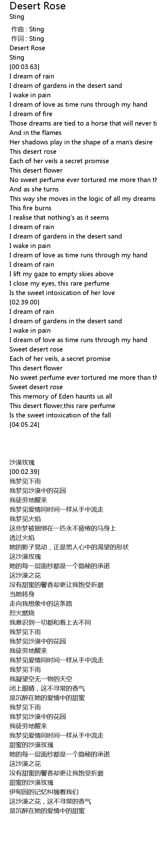 | [00:58.93] | I dream of gardens in the desert sand |