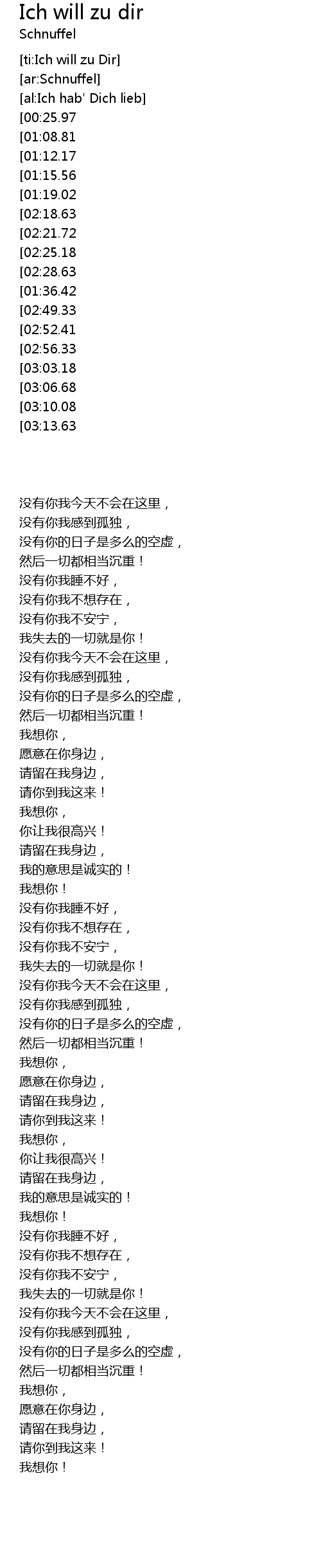| [01:50.27][03:13.63][04:09.36] | Ich will zu dir! |