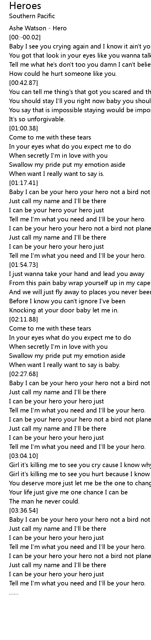 | [01:17.58] | Baby I can be your hero your hero not a bird not plane |