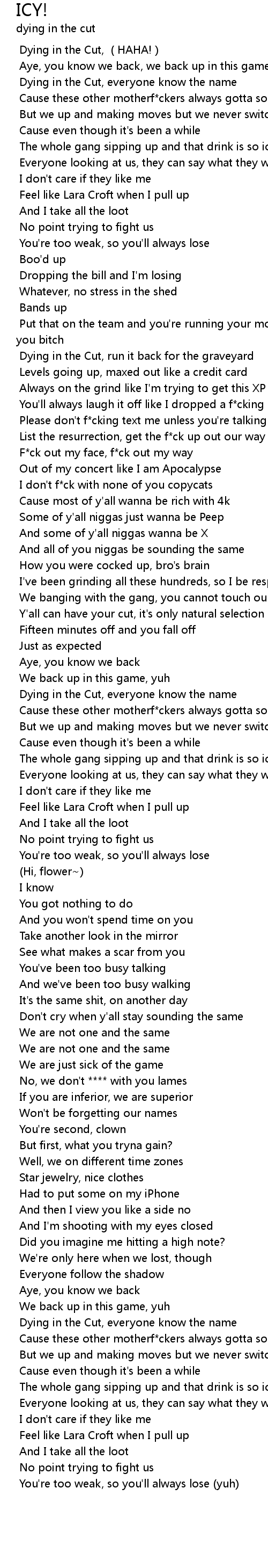 Dying in the Cut, run it back for the graveyard |