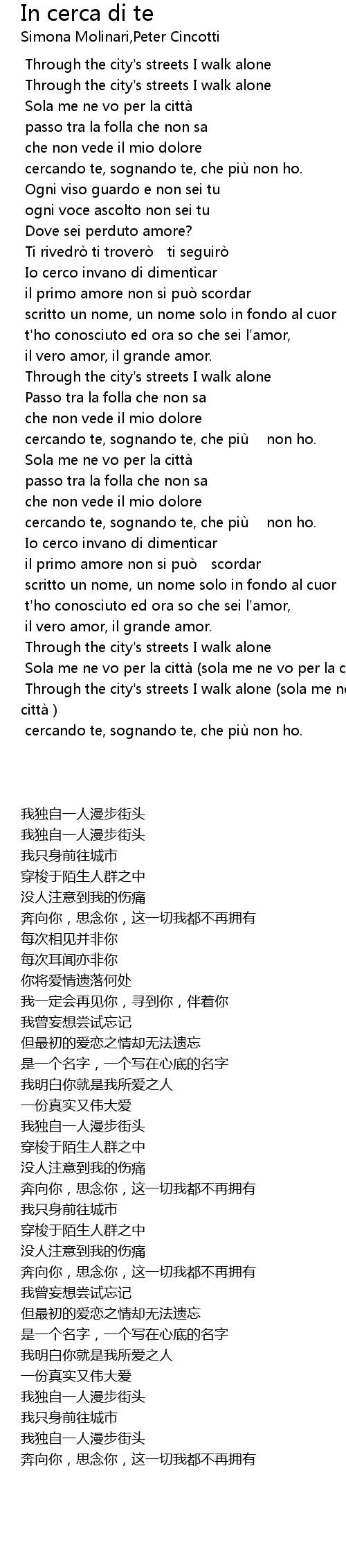 | [00:30.264] | cercando te, sognando te, che piu non ho. |