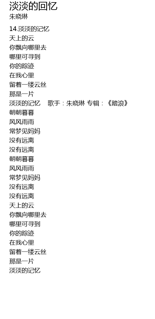 | [00:44.38] | 淡淡的记忆 歌手:朱晓琳 专辑:《踏浪》 |