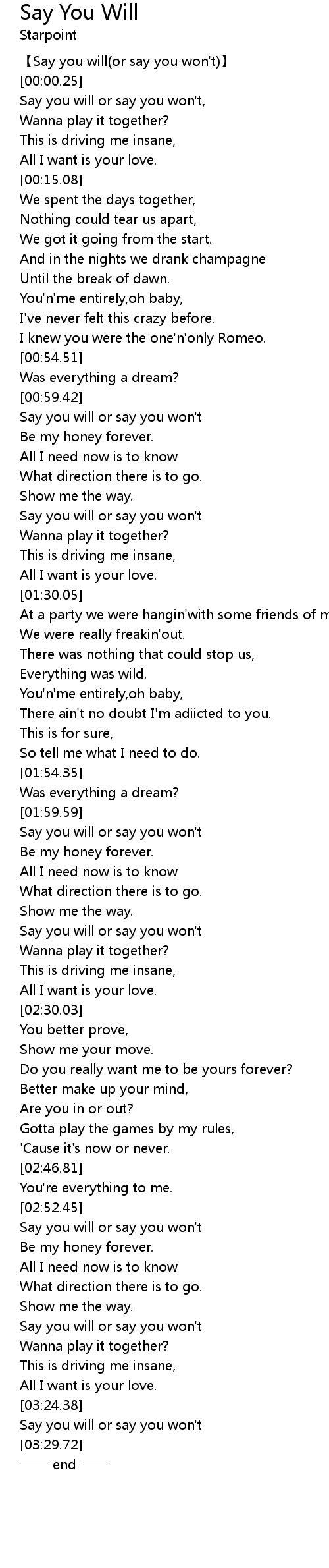 | [00:00.10] | 【Say you will(or say you won't)】 |