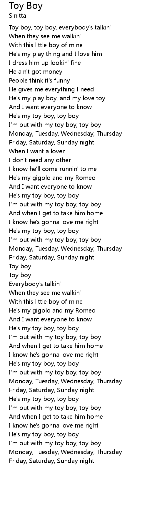 | Toy boy, toy boy, everybody's talkin' | |