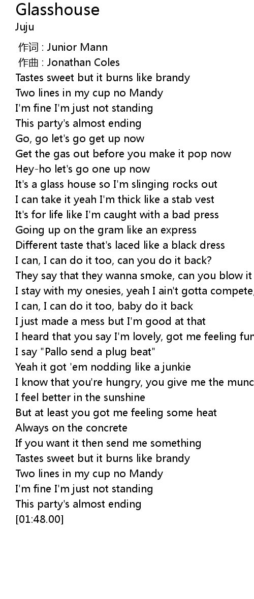 | [00:40.46] | It' s a glass house so I' m slinging rocks out |