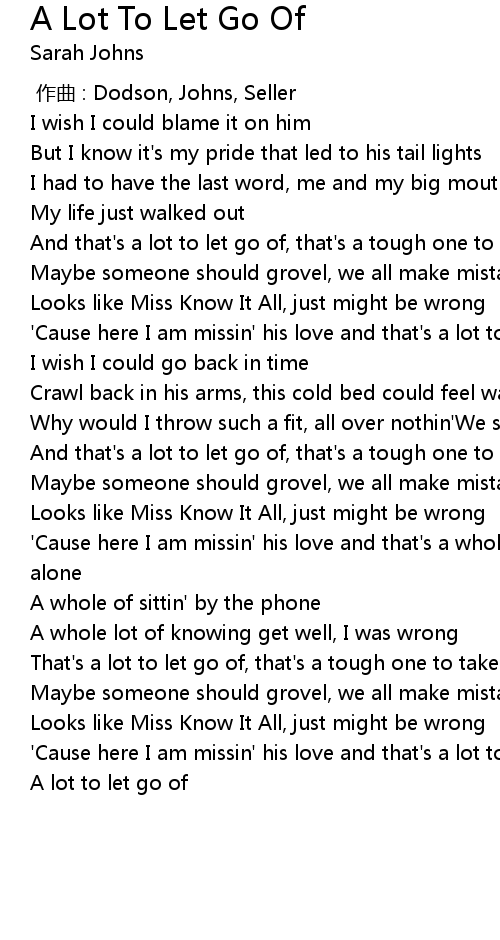 | [02:41.201] | 'Cause here I am missin' his love and that's a lot to let go of |