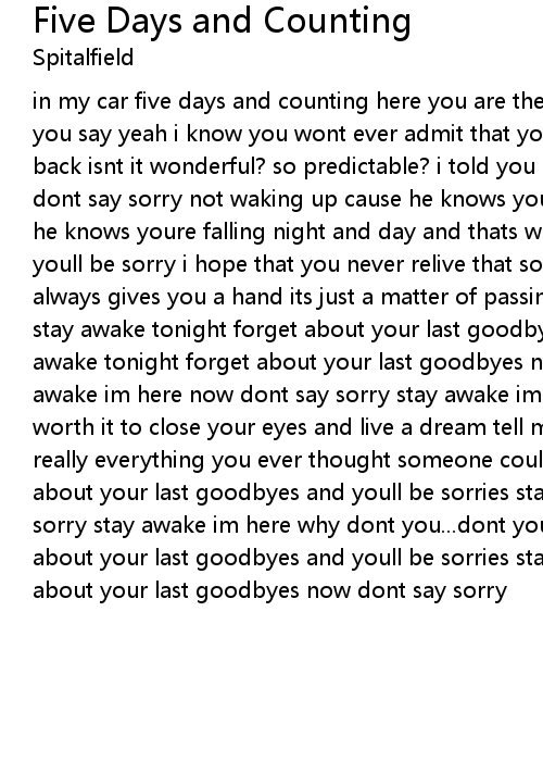 in my car five days and counting here you are the phone rings what more could you say yeah i know you wont ever admit that you fell for him he never loved you back isnt it wonderful? so predictable? i told you so stay awake im here now dont say sorry not waking up cause he knows youre calling hes holding back cause he knows youre falling night and day and thats why hes stalling but one day youll be sorry i hope that you never relive that something tells me trouble always gives you a hand its just a matter of passing time after time after time stay awake tonight forget about your last goodbyes and youll be sorries stay awake tonight forget about your last goodbyes now dont say sorry say sorry stay awake im here now dont say sorry stay awake im here why dont you tell me is it worth it to close your eyes and live a dream tell me was it perfect was he really everything you ever thought someone could be stay awake tonight forget about your last goodbyes and youll be sorries stay awake im here now dont say sorry stay awake im here why dont you...dont you stay awake tonight just forget about your last goodbyes and youll be sorries stay awake tonight just forget about your last goodbyes now dont say sorry |