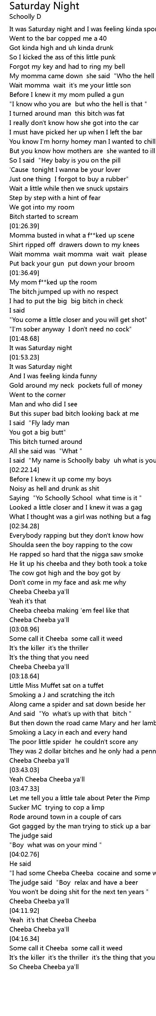 [04:03.87] "I had some Cheeba Cheeba cocaine and some wine "