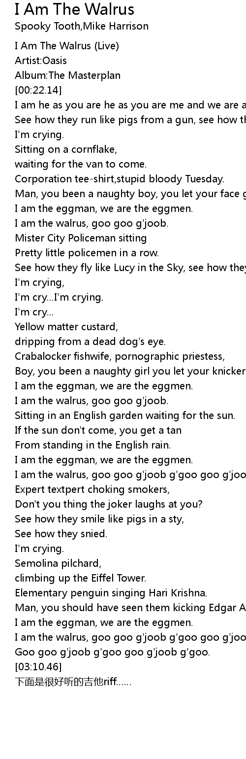 | [01:48.30] | I am the walrus, goo goo g' joob. |