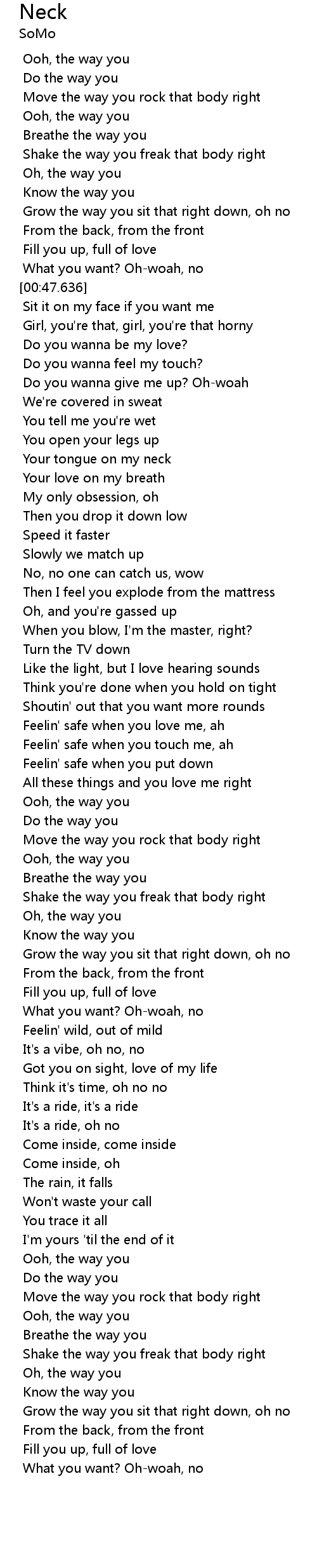 | [01:12.635] | Your tongue on my neck |