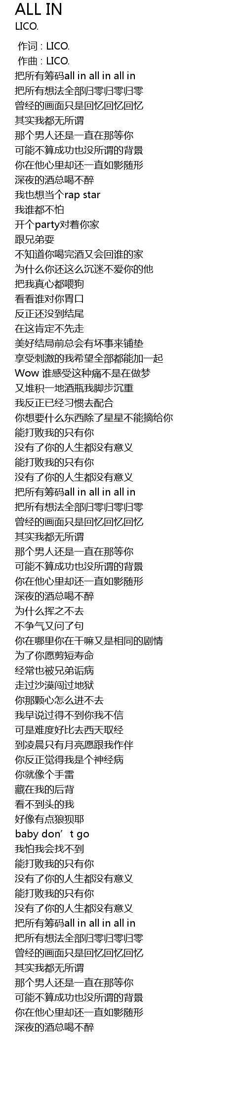 | [02:39.676] | bǎ suǒ yǒu chóu mǎ all in all in all in |