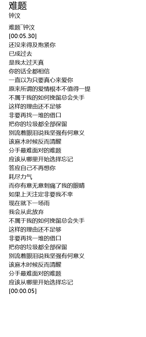 | [00:02.09] | 难题―钟汶 |