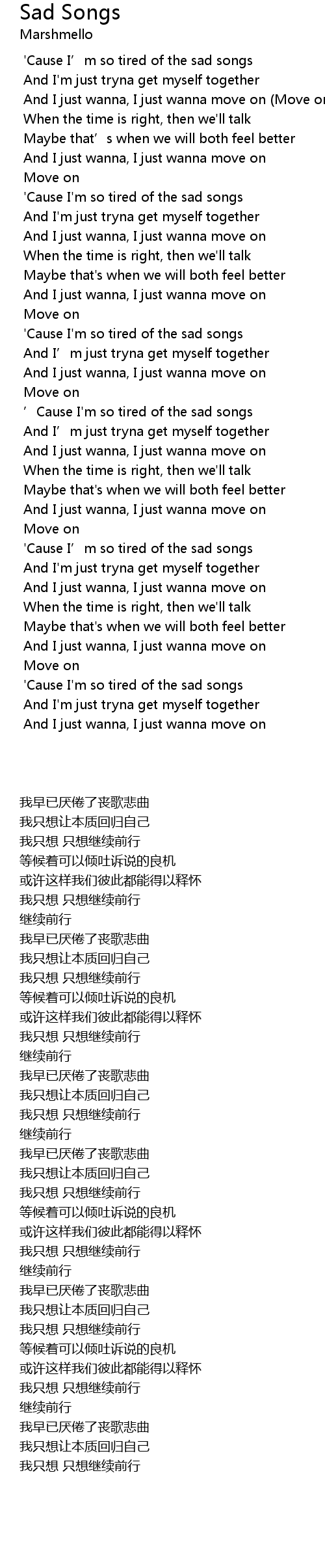 | [00:38.441] | ' Cause I' m so tired of the sad songs |