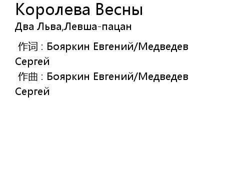 | [00:00.00-1] | 作词 : Бояркин Евгений/Медведев Сергей |