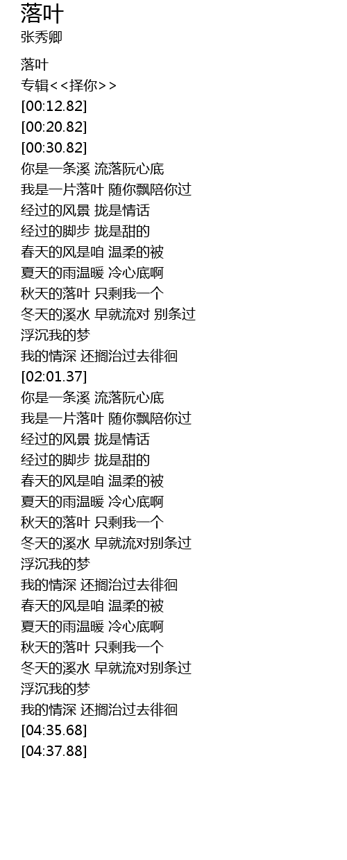 | [02:22.97] | 我是一片落叶 随你飘陪你过 |