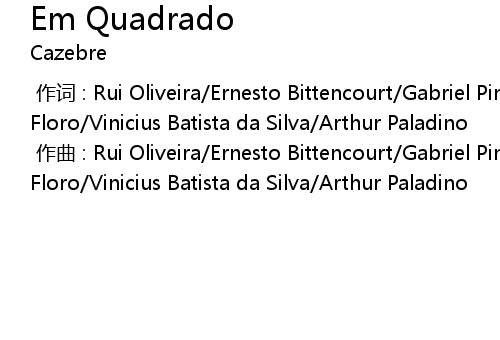 | [00:00.00-1] | zuò qǔ : Rui Oliveira Ernesto Bittencourt Gabriel Pinheiro Floro Vinicius Batista da Silva Arthur Paladino |