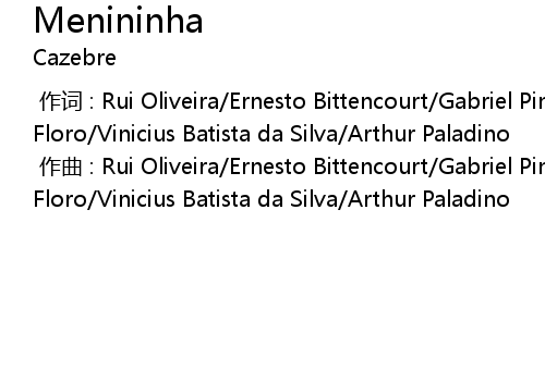 | [00:00.00-1] | zuo qu : Rui Oliveira Ernesto Bittencourt Gabriel Pinheiro Floro Vinicius Batista da Silva Arthur Paladino |