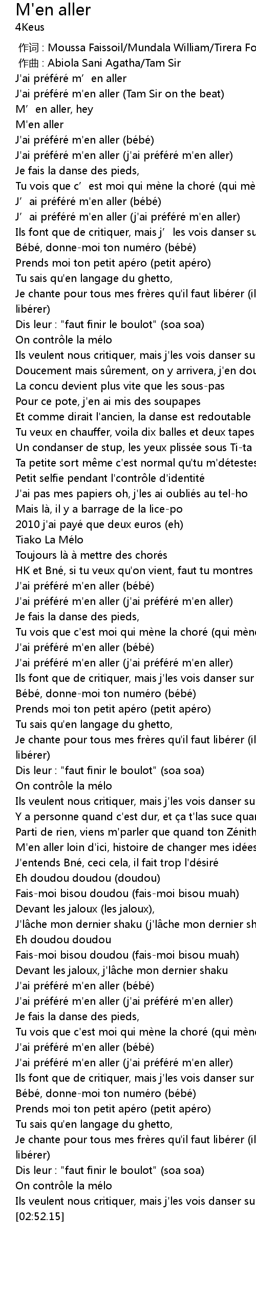 | [02:21.55] | J'ai préféré m'en aller (j'ai préféré m'en aller) |
