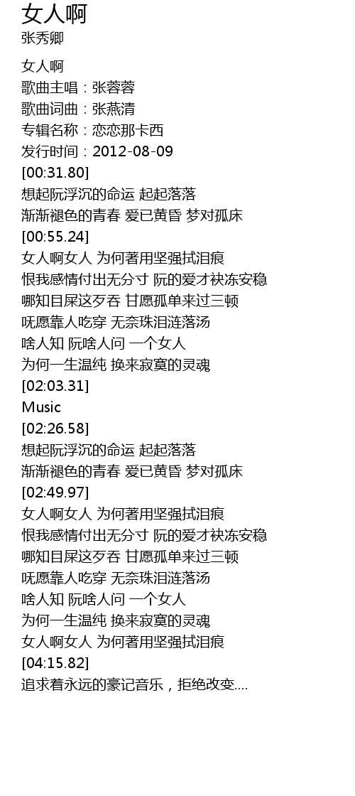 | [00:55.43] | 女人啊女人 为何著用坚强拭泪痕 |