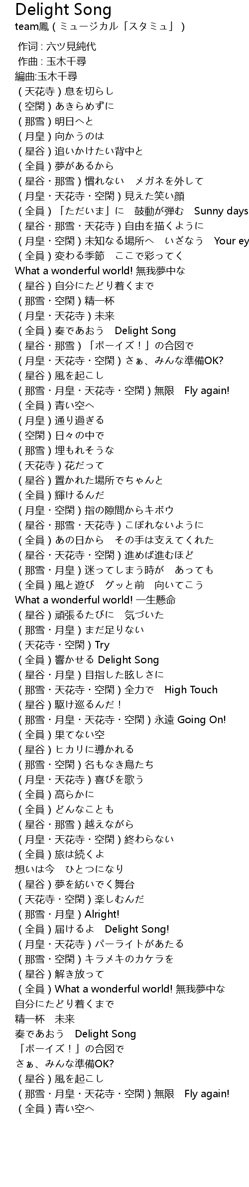 | [01:08.0] | (全員)奏であおう Delight Song |